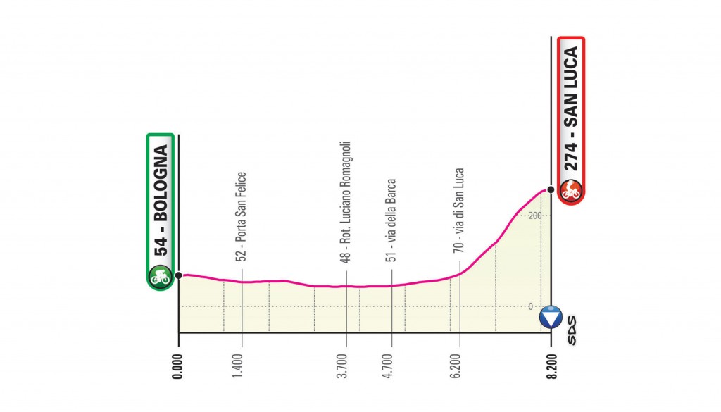 Sin embargo, no se tratará de un tramo íntegramente para especialistas, porque finalizará en el Santuario de Nuestra Señora de San Luca. Allí se accederá por una subida de 2.1 km, con una pendiente media del 9.7% y rampas máximas del 18%. Además, Bologna también acogerá la partida de la segunda jornada.