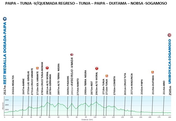 En respuesta al tweet de Pablo Palermo, la subida al paramo el verjon se encuentra en buen estado, recientemente fue pavimentada la primera parte del puerto y la parte final que presentaban fallas geológicas,. En cuanto al clima es muy impredecible, además de que en la parte final el viento en ocasiones es un factor de bido a la ausencia de árboles, es bueno también mencionar que de la altimetria que se muestra en la imagen, solo se recorren los 12.5 primeros kms que es donde termina la etapa en el parador el Márquez del 11, el paramo como tal esta unos 6km adelante a una altura de 3376 msnm. Espero sea de su ayuda. Saludos