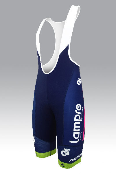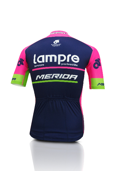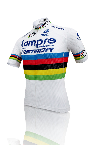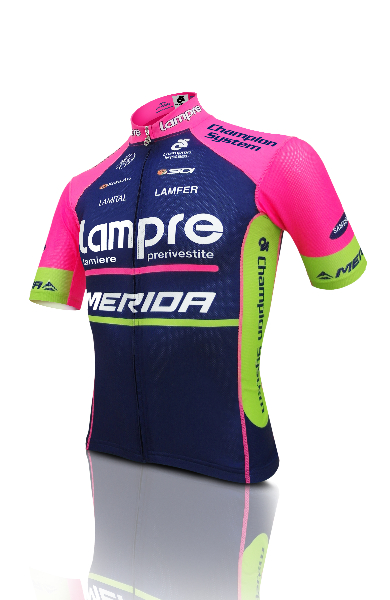 Los patrocinadores que aparecen en el maillot son Lampre, Merida; Champion System; Samsung; Lamital; Lamfer; Sidi; Kabuto y el logo del UCI World Tour.