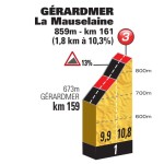 En la toma de contacto con la montaña, el pelotón deberá superar tres escollos durante la jornada: el primero será en el Km 142, el Col de la Croix des Moinats de 2° categoría (7.6 km al 6%). Tras un descenso de 5 kilómetros volverán a pararse en los pedales para dar paso a Col de Grosse Pierre (3 km al 7.5%), un puerto de 2° categoría que se corona a 11 kilómetros de la meta que dará paso a la última cota donde estará la línea de sentencia, la Côte de La Mauselaine (3° categoría-1.8km al 10.3%), que decidirá al ganador de la etapa.