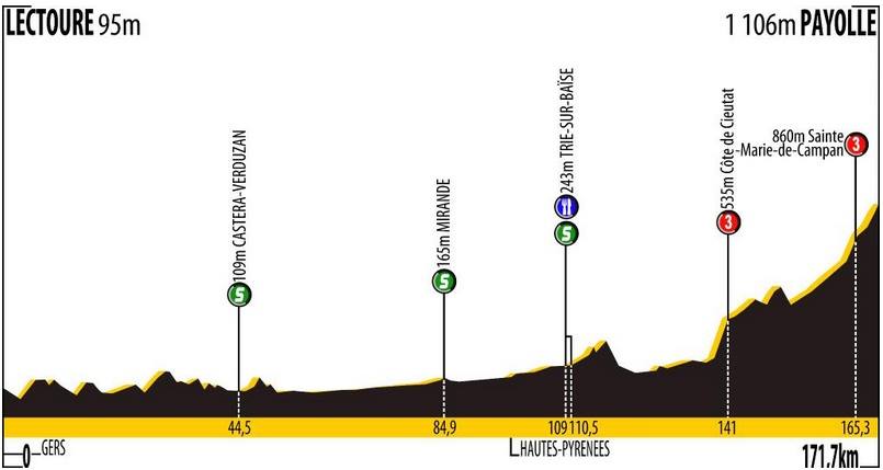 La etapa 1 comenzará en Lectoure. Con tres sprints intermedios, los pedalistas deberán superar dos puertos de tercera categoría, el último de ellos a 6 kilómetros de la meta, para arribar en alto a Payolle tras 171 kilómetros.
