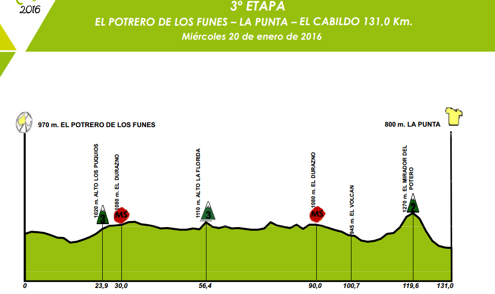 La otra variante a remarcar es la etapa 3, que saldrá desde Potrero rumbo a la Punta. De ese modo, el final no será de montaña, sino que se atravesará el Mirador del Potrero de los Funes (4.8 kilómetros al 6,7% ). La trepada se corona a 12 kilómetros del arribo, por lo que se presta para un interesante desenlace frente al Cabildo entre un grupo reducido de atletas.